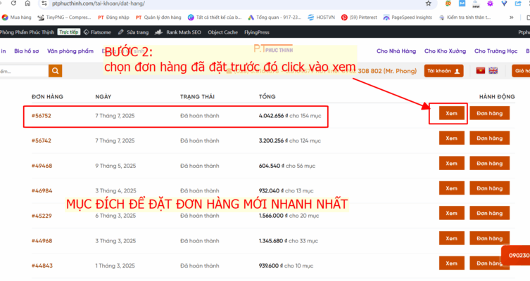BƯỚC 2: chọn đơn hàng đã đặt trước đó – click vào xem