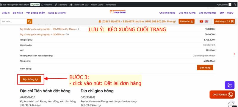BƯỚC 3: kéo xuống cuối trang – Click vào đặt lại đơn hàng