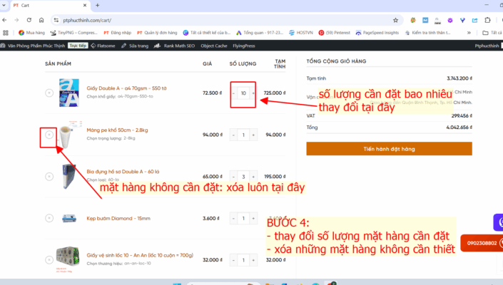 BƯỚC 4: Thay đổi số lượng hoặc xóa sản phẩm (Theo hình dưới)