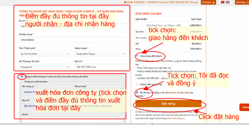 Bước 8: Điền đầy đủ thông tin người nhận. Nếu cần xuất hóa đơn công ty, hãy chọn mục “Xuất hóa đơn VAT” và cung cấp thông tin chi tiết.. – click đặt hàng