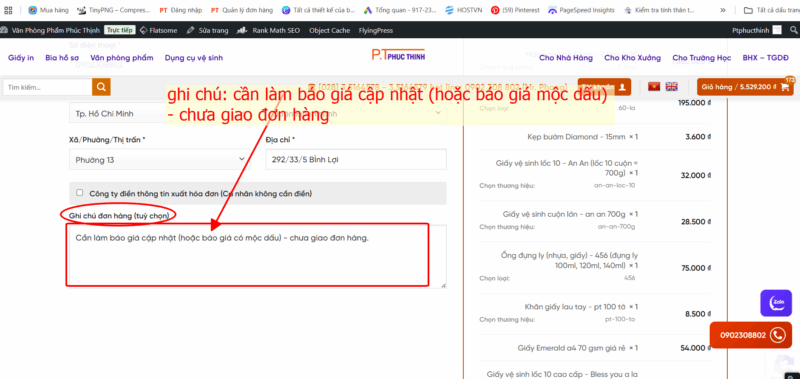 - Bước này là bước kiểm tra báo giá cập nhật (vì trong phần ghi chú: khách hàng đã ghi báo giá cập nhật – không giao), nên Nhân Viên Phúc Thịnh xem trong nội dung ghi chú sẽ hiểu Khách hàng đang cần báo giá – sẽ không xuất đơn hàng này)